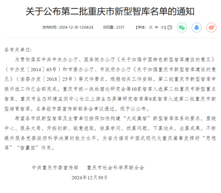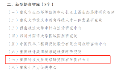 近期,市委宣传部与市社会科学界联合会共同发布了“第二批重庆市新型智库名单”,凯发k8官网下属重庆科技开展战略研究院公司成功入选新型培育智库。